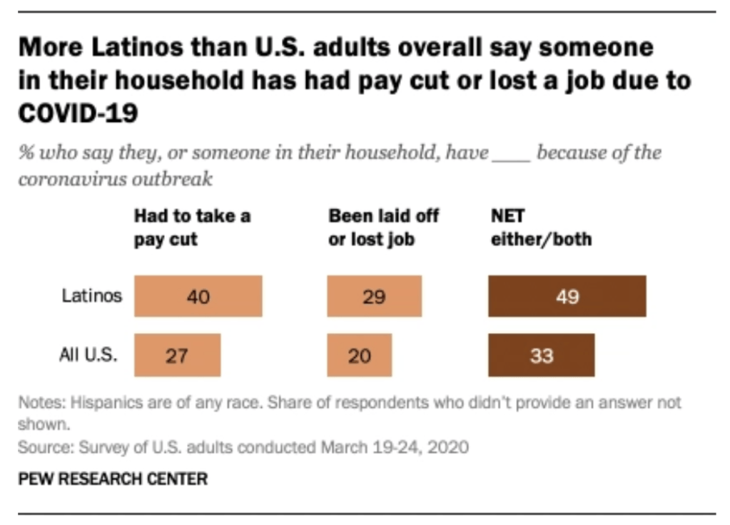 La pandemia de COVID-19 y el resultado de la devastación en la comunidad latina en los Estados Unidos. Debido a los trabajadores latinos que han enfrentado grandes pérdidas de puestos de trabajo, particularmente entre las latinas en la industria de servicios. Los hispanos o latinos, junto con otras comunidades de color, también se han visto perjudicados de manera desproporcionada por la situación económica: representaron el 23 % de la pérdida inicial de empleo debido a la pandemia, mientras que representaron solo el 16 % de la población civil. Las mujeres hispanas / latinas también han experimentado impactos económicos desproporcionados.